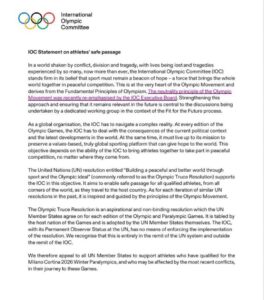 As a global organization, the IOC operates within a complex world. Each edition of the Olympic Games takes place against the backdrop of current political events. Despite these challenges, the IOC stated that its mission is to maintain a global sporting platform based on shared values, one that offers hope by allowing athletes from all nations to compete peacefully together.