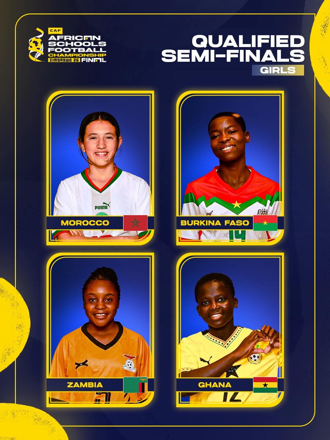 All four semi-finals will be played on Thursday at Gateway High School, with the girls taking the pitch first. Morocco and Burkina Faso will kick off at 10:00am followed by Zambia’s clash with Ghana at 11:40am