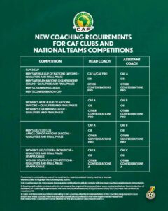 The Confederation of African Football (CAF) has announced updated coaching requirements for all clubs and national teams participating in its competitions. This decision is aimed at raising the quality of coaching across the continent, with the goal of improving the structure, strength, and overall standard of play.