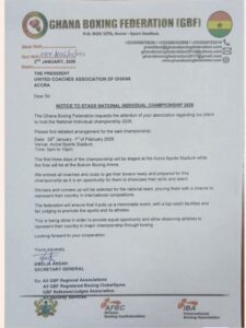 The Ghana Boxing Federation (GBF) has officially announced plans to host the National Individual Championship 2026. In a notice directed to the United Coaches Association of Ghana, the Federation outlined the event details and extended an invitation to all coaches and boxing clubs across the country.