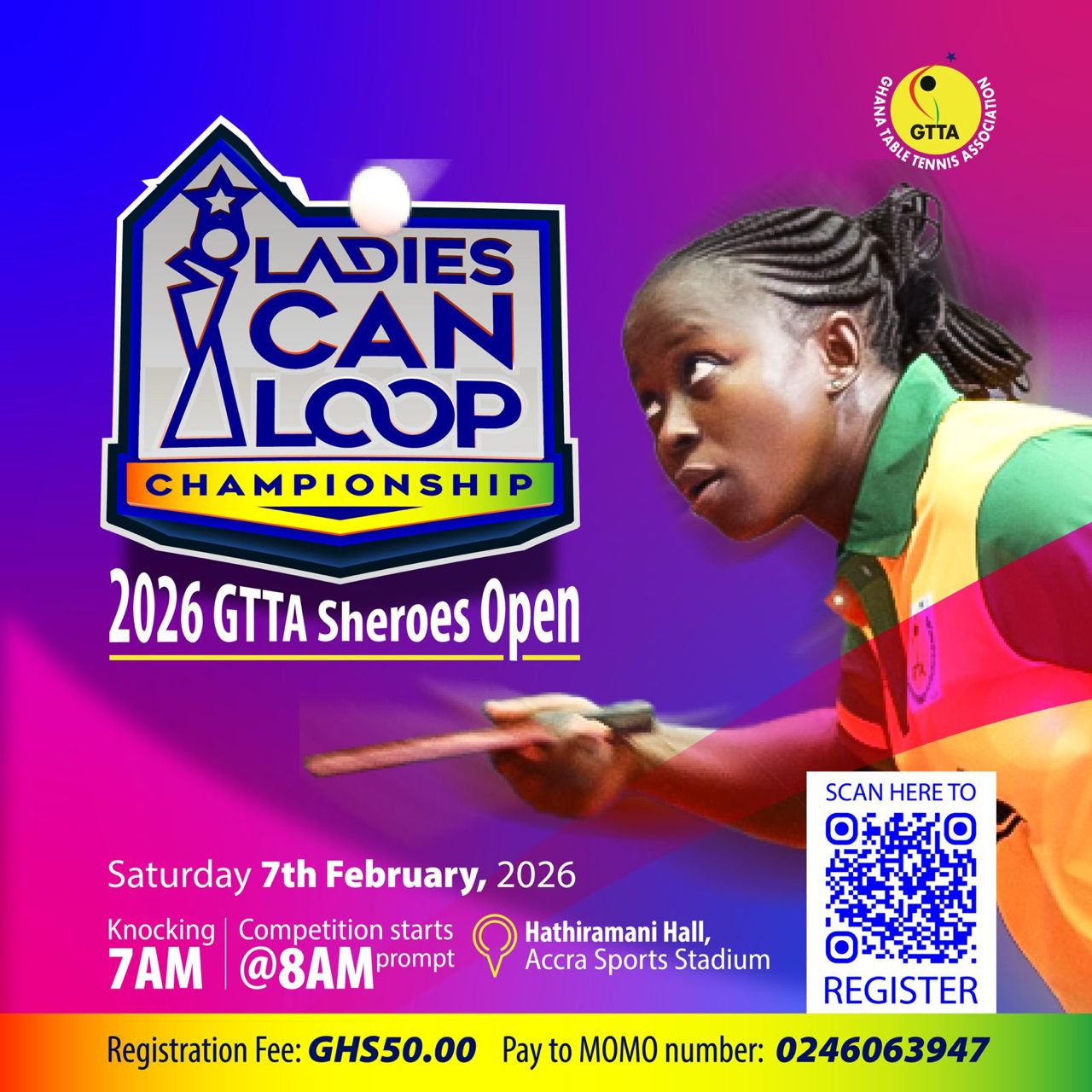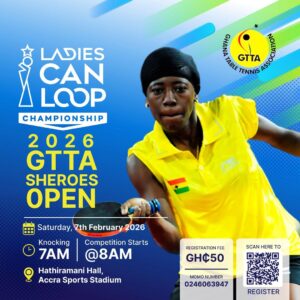 The Ghana Table Tennis Association (GTTA) will launch the 2026 Sheroes Tournament on February 7, 2026. The event, also called the “Ladies Can Loop Championship,” will be held at the D G Hathiramani Hall at the Accra Sports Stadium.