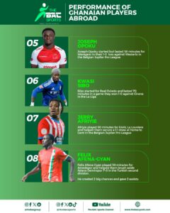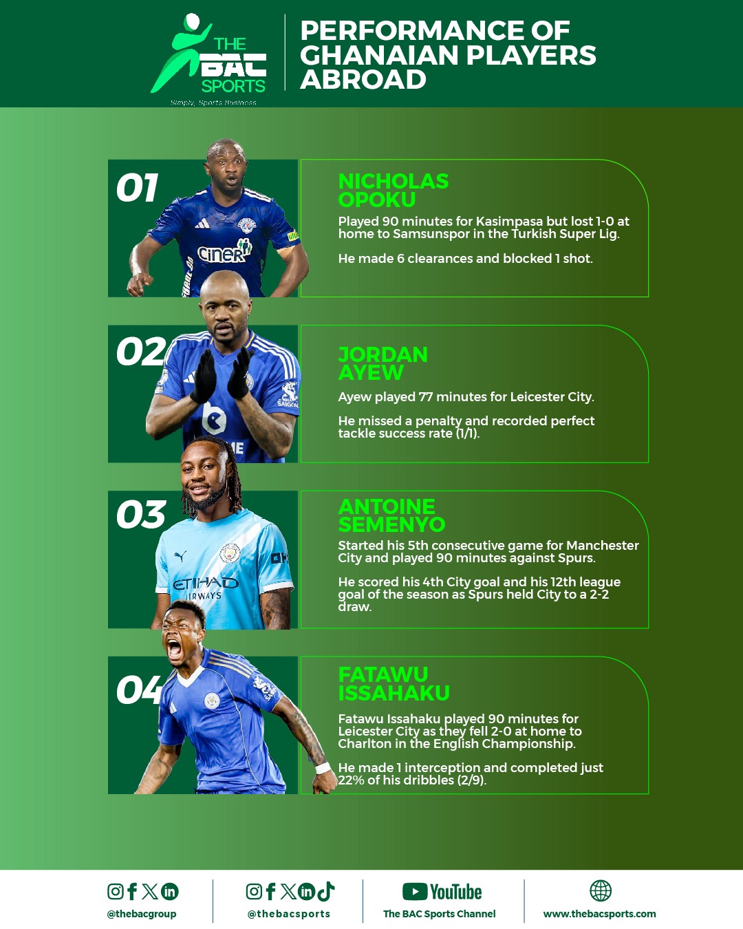 Overall, it was a productive weekend for Ghanaian players abroad, highlighted by goals from Antoine Semenyo and Ibrahim Sulemana, creative brilliance from Felix Afena-Gyan, and several strong defensive displays across Europe.