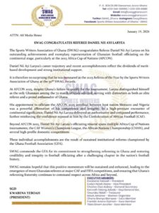 The Sports Writers Association of Ghana (SWAG) has extended its congratulations to referee Daniel Nii Ayi Laryea for his outstanding achievements and for being a fine example of Ghanaian football officiating across Africa.