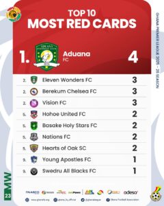 On the discipline front, Aduana FC have received the most red cards this season with 4. They are followed by Eleven Wonders FC, Berekum Chelsea FC, and Vision FC, who each have 3 red cards to their name.
