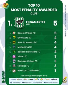 They are followed by Karela United FC, Goldstars SC, and Asante Kotoko SC in the rankings for most penalty awards.