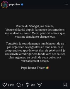“People of Senegal, my family,” Thiaw said, “Your solidarity since the announcement of the sanctions has touched me deeply. Thank you for the love you show me every day.”