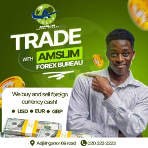 For all your forex transactions and trades, look no further than Amslim Forex Bureau. Location is at Ajiringanor, East Legon. Catch them on Instagram at @amslim_forex.