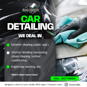 For the best of car cleaning services, Contact Sauber Car Detailing on 0597706656. Locate them in East Legon, Trassaco Road. Find more about Sauber on Instagram: @sauber2021