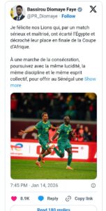 “I congratulate our Lions who, through a serious and controlled match, have overcome Egypt and secured their place in the Africa Cup final,” President Faye stated. He added, “One step away from glory, continue with the same clarity, the same discipline, and the same collective spirit, to offer Senegal a new star and a pride shared by the entire Nation.”
