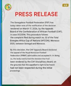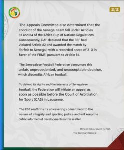 The Senegalese Football Federation has denounced the decision as “unfair, unprecedented and unacceptable,” vowing to file an appeal before the Court of Arbitration for Sport in Lausanne, Switzerland.