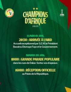 The champions are scheduled to arrive at Blaise Diagne International Airport (AIBD) on Monday evening, January 19, for an exceptional welcome by His Excellency President Bassirou Diomaye Faye and the Government.
