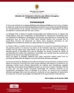 The Government of Senegal renewed its sincere thanks to the Kingdom of Morocco and expressed its hope that this Africa Cup of Nations would stand as a solid marker of an Africa decisively moving towards excellence. The statement concluded with a wish for the positive momentum to further strengthen the privileged relations of friendship and cooperation between Senegal and Morocco.