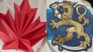 Finland will take the ice wearing jerseys centered on the nation’s powerful and historic crest.The symbol features a crowned lion, whose right foreleg is a suit of armor wielding a sword, with its hind legs trampling a curved saber.