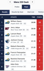 Opare led a strong showing from Angelo State in the event. Teammates Rami Balti and Jahleel Armstrong also scored points for the Rams, finishing second and fourth with times of 46.55 and 47.22 seconds respectively.